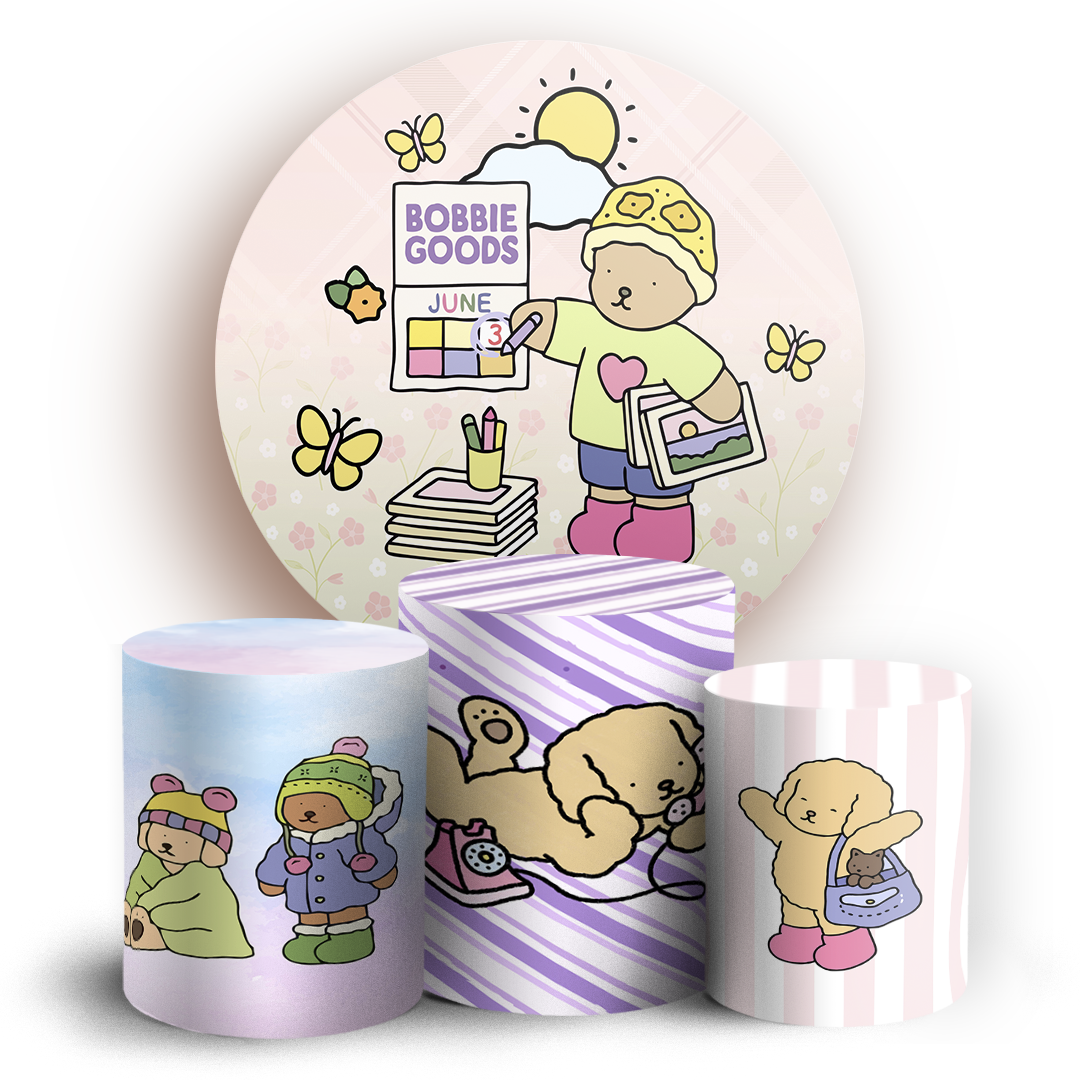 O kit Painel Redondo + Trio de capas para cilindros sublimados veste fácil, possuem acabamento overloque e elásticos nas bordas para facilitar a montagem da decoração