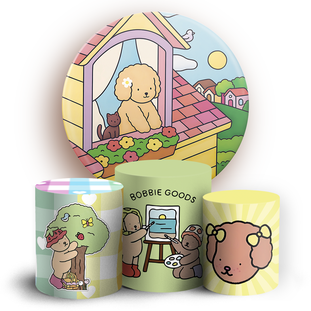 O kit Painel Redondo + Trio de capas para cilindros sublimados veste fácil, possuem acabamento overloque e elásticos nas bordas para facilitar a montagem da decoração