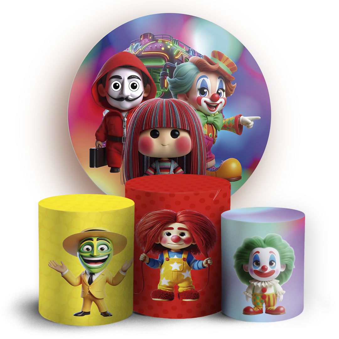 O kit Painel Redondo + Trio de capas para cilindros sublimados veste fácil, possuem acabamento overloque e elásticos nas bordas para facilitar a montagem da decoração