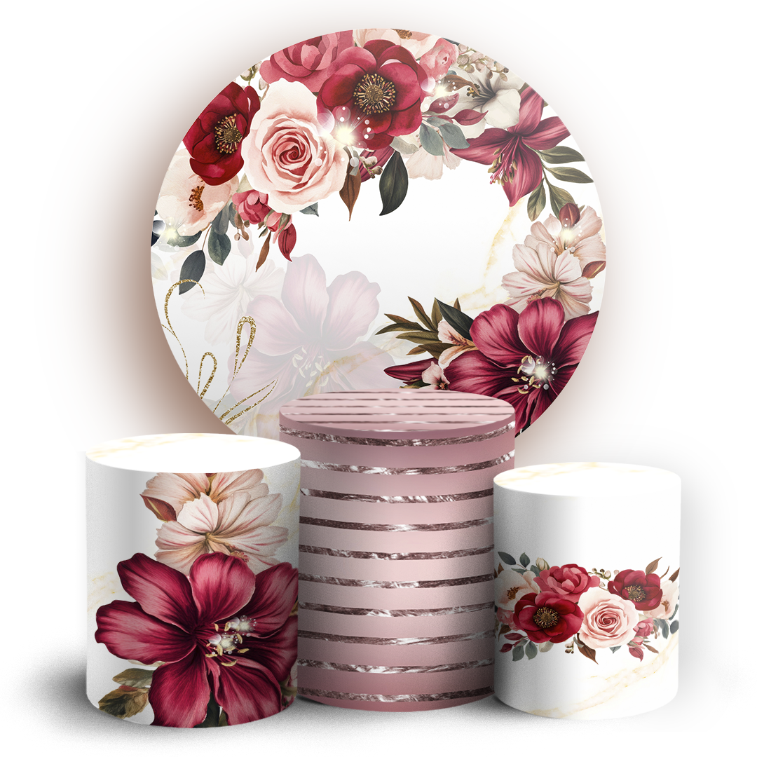 O kit Painel Redondo + Trio de capas para cilindros sublimados veste fácil, possuem acabamento overloque e elásticos nas bordas para facilitar a montagem da decoração