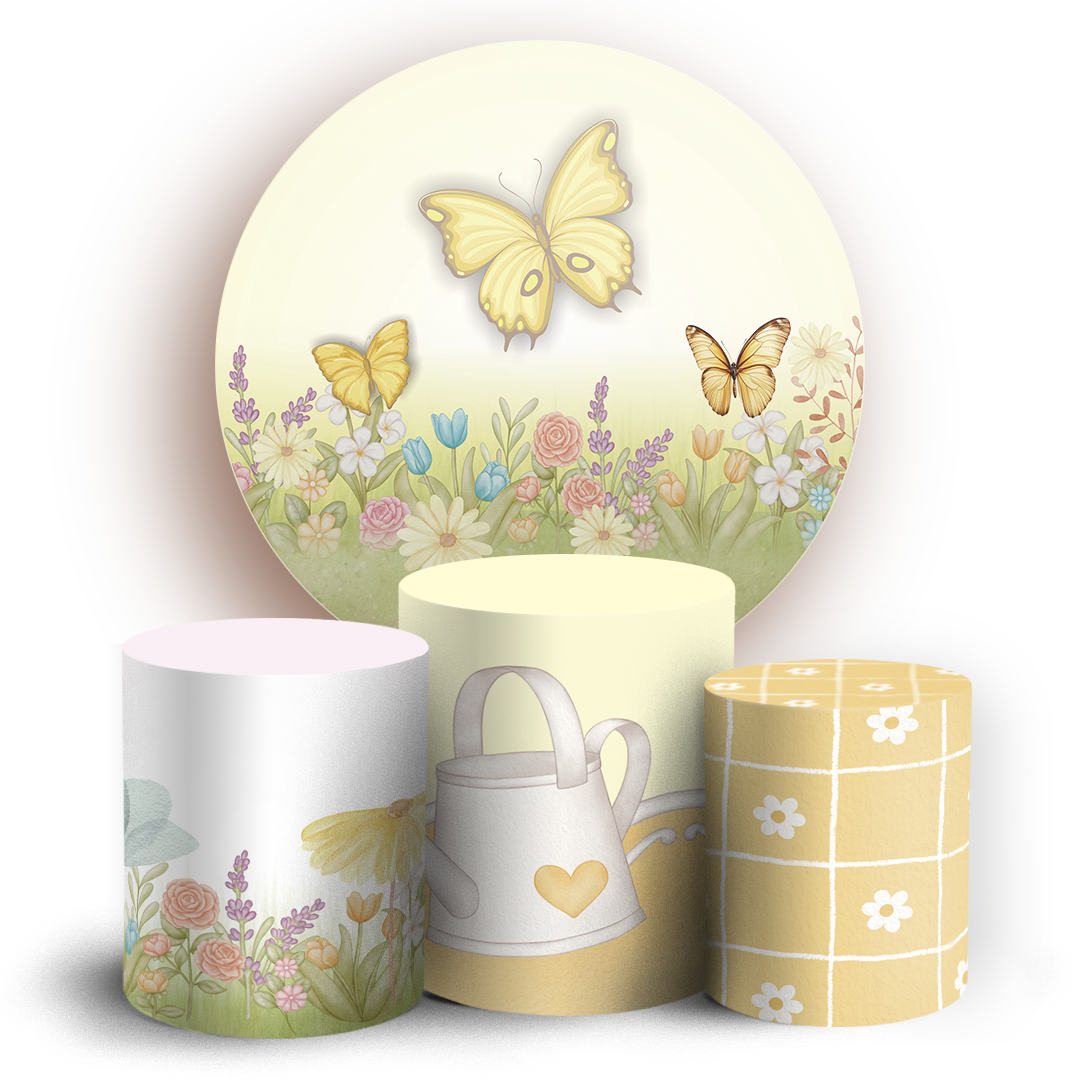 O kit Painel Redondo + Trio de capas para cilindros sublimados veste fácil, possuem acabamento overloque e elásticos nas bordas para facilitar a montagem da decoração