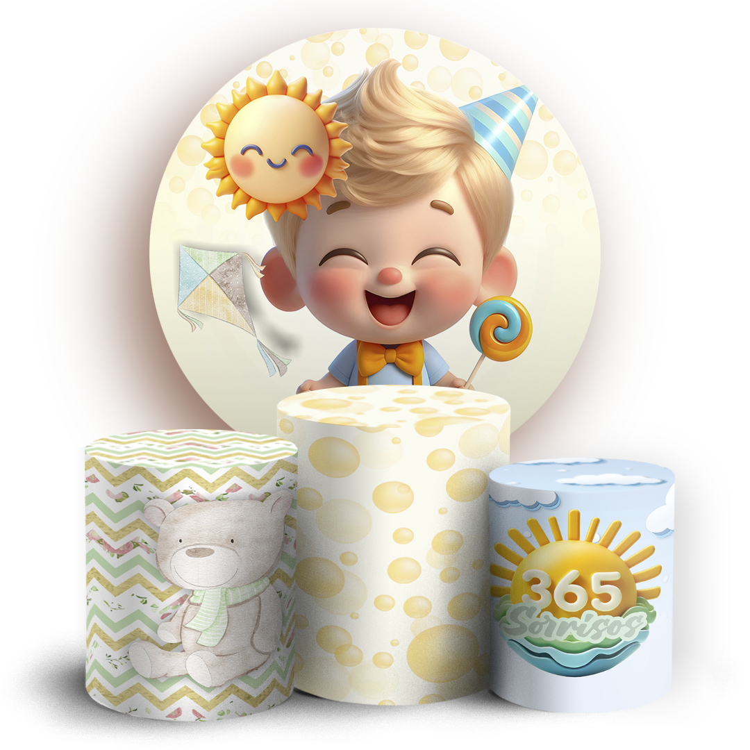 O kit Painel Redondo + Trio de capas para cilindros sublimados veste fácil, possuem acabamento overloque e elásticos nas bordas para facilitar a montagem da decoração