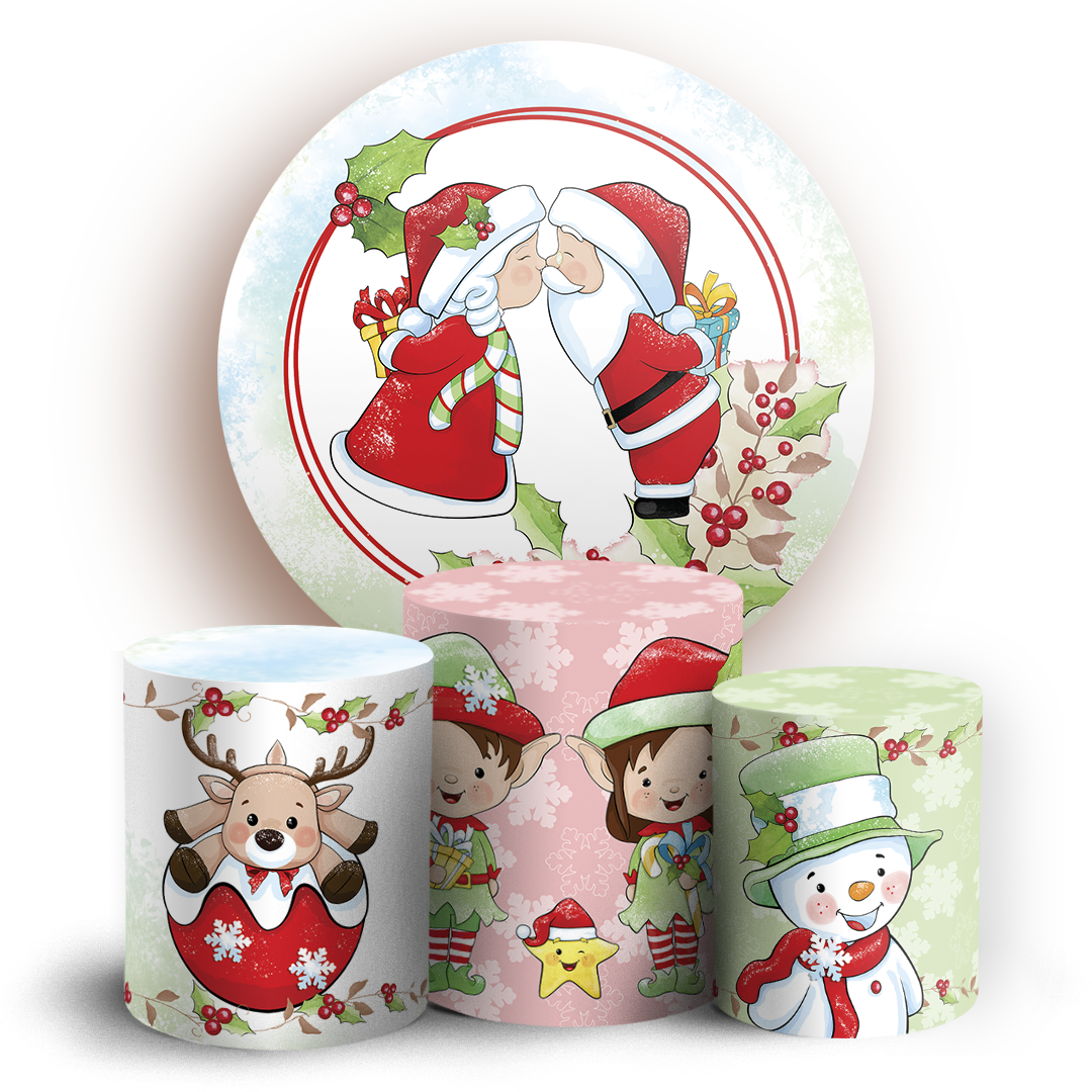 O kit Painel Redondo + Trio de capas para cilindros sublimados veste fácil, possuem acabamento overloque e elásticos nas bordas para facilitar a montagem da decoração