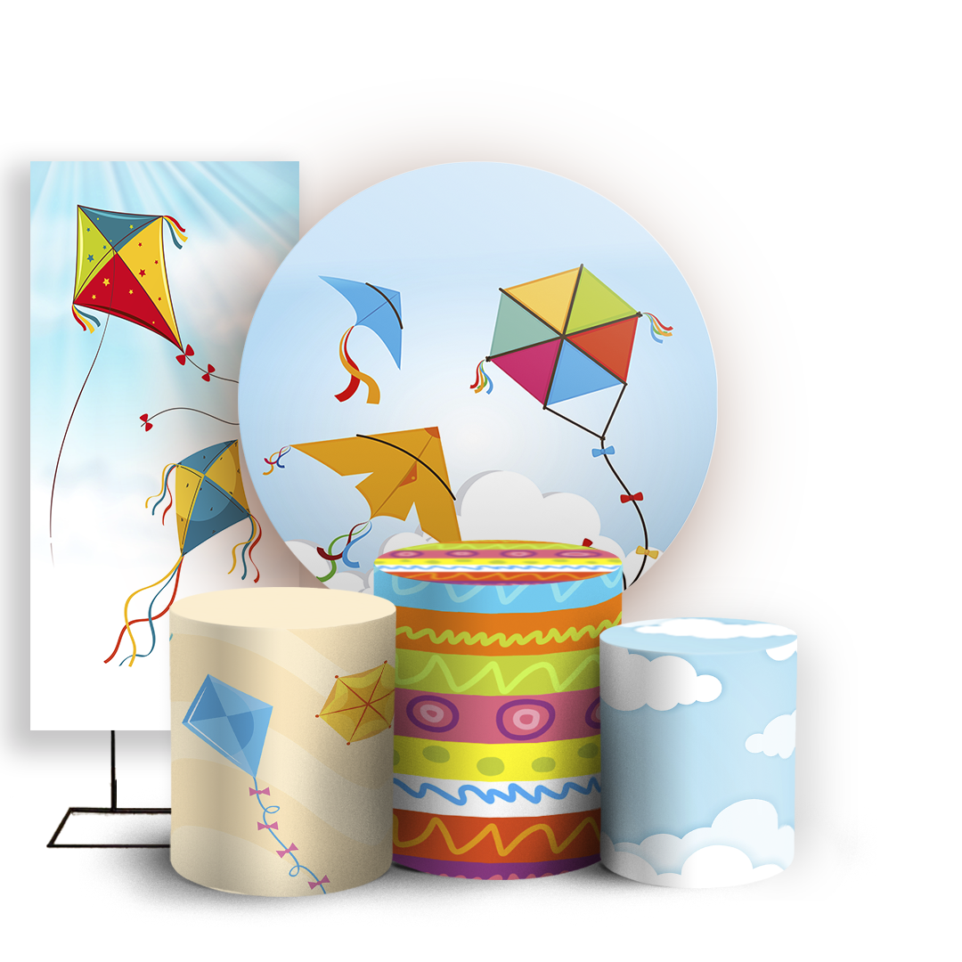 Com o kit Redondo, Trio de capas e Faixa lateral você criar uma decoração criativa para qualquer festa ou evento.