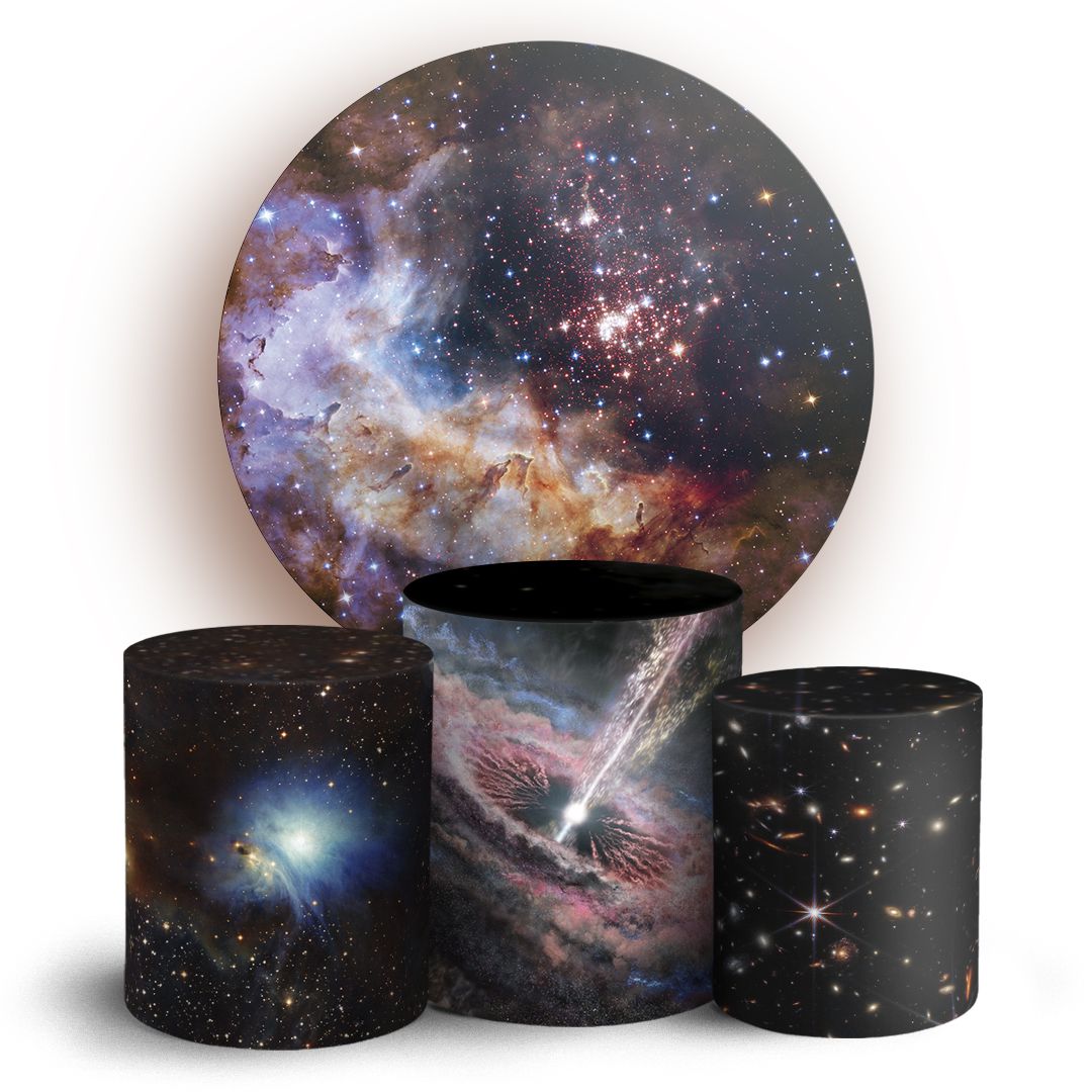 O kit Painel Redondo + Trio de capas para cilindros sublimados veste fácil, possuem acabamento overloque e elásticos nas bordas para facilitar a montagem da decoração