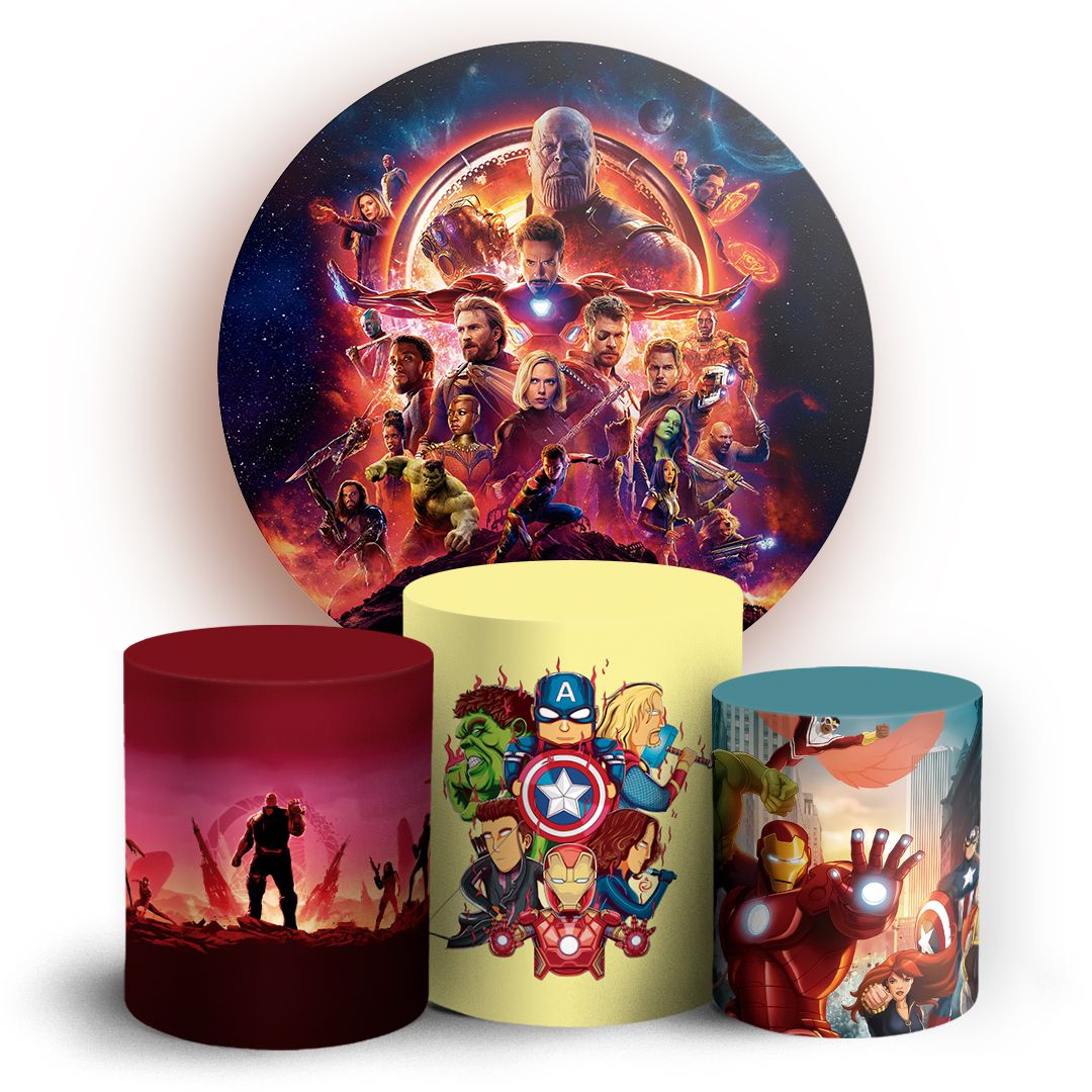 O kit Painel Redondo + Trio de capas para cilindros sublimados veste fácil, possuem acabamento overloque e elásticos nas bordas para facilitar a montagem da decoração