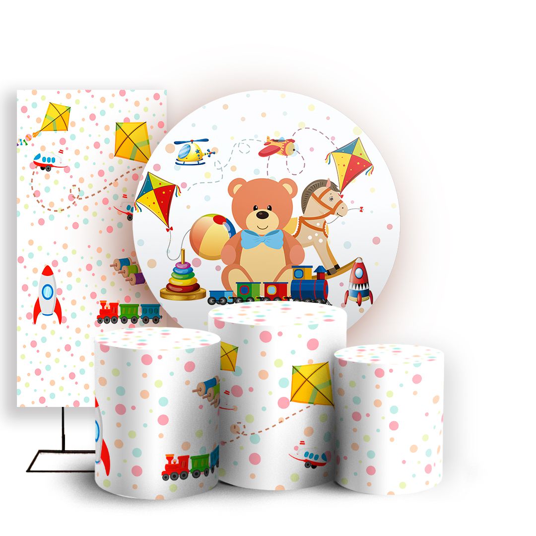Com o kit Redondo, Trio de capas e Faixa lateral você criar uma decoração criativa para qualquer festa ou evento.